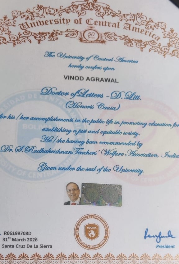 कोलकाता।  शहर के नामचीन चार्टर्ड अकाउंटेंट ओर बिड़ला समूह में पिछले ४६ वर्षों से उच्च प्रबंधन अधिकारी के रूप में कार्यरत, प्रेरक वक्ता सीए विनोद अग्रवाल, महासचिव श्री शिक्षायतन स्कूल,शिक्षायतन फाउंडेशन को हाल ही में युनिवर्सिटी ऑफ सैंट्रल अमेरिका द्वारा मानद डी.लिट. की उपाधि, उनके सार्वजनिक जीवन में शिक्षा के योगदान एवं मोटिवेशनल शैशन द्वारा समावैसिक समाज की संरचना के निरंतर प्रयास हेतु नवाजा गया है।