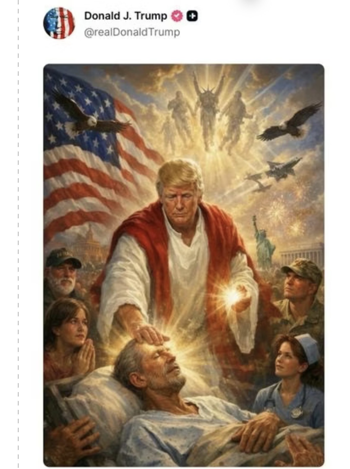 डोनाल्ड ट्रम्प ने सोशल मीडिया से उन्हें जीजस के रूप में दिखाने वाली तस्वीर हटा दी है। इस तस्वीर में वे एक बीमार व्यक्ति को ठीक करते नजर आ रहे थे।